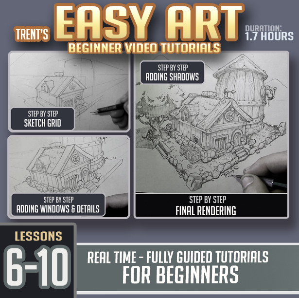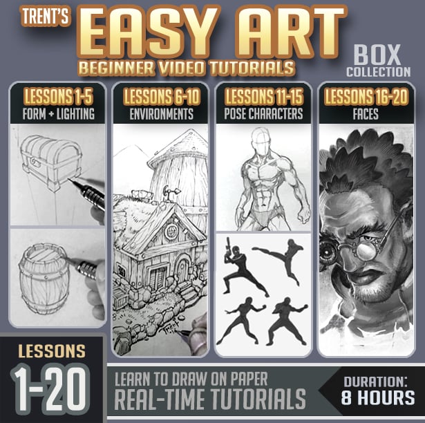 Learning the fundamentals of drawing doesn't have to be boring. You don't need to stress out over some checklist of mathematical equations to draw cool stuff. I've developed the EASY ART method to get straight to the point in STEP BY STEP real-time lessons that you can follow along with. Each lesson contains homework for you to practice, and improve on your own. After a few days you'll be able to draw and render characters, place them in an environment and make your world come alive all on paper. These skills will be ESSENTIAL for any artist to transition into digital or 3d to work in games or on your own comics or novels.