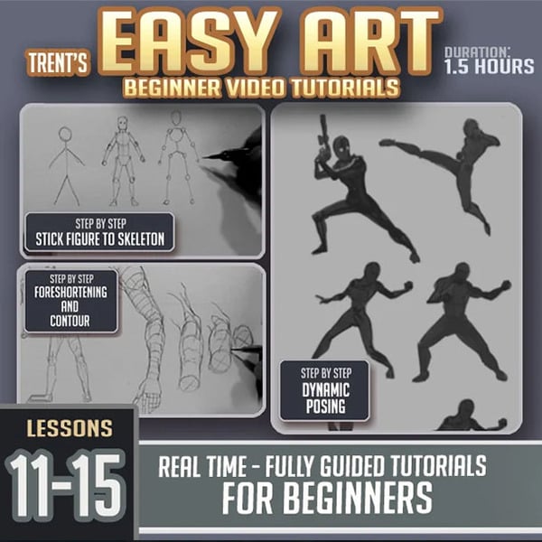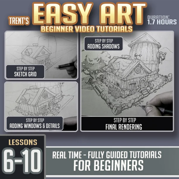 Learning the fundamentals of drawing doesn't have to be boring. You don't need to stress out over some checklist of mathematical equations to draw cool stuff. I've developed the EASY ART method to get straight to the point in STEP BY STEP real-time lessons that you can follow along with.  Each lesson contains homework for you to practice, and improve on your own. After a few days you'll be able to draw and render characters, place them in an environment and make your world come alive all on paper. These skills will be ESSENTIAL for any artist to transition into digital or 3d to work in games or on your own comics or novels.